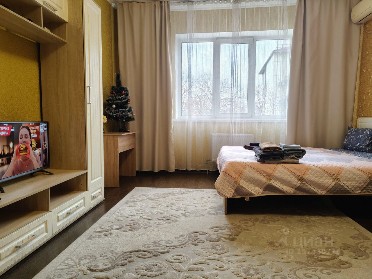 - Двуспальная кровать, диван кровать в комнате и диван-кровать на кухне;