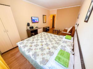WI-Fi интернет , ЖК-телевизор , сплит-система, холодильник, эл.чайник, утюг, микроволновая печь,мебель, шкаф для одежды, посуда, всегда свежее постельное бельё, полотенца и средства гигиены . 4 спальных места Бокс-кровати - возможность трансформации двухместной кровати в две отдельные кровати, удобный двухместный раскладной диван . Для постоянных клиентов действуют скидки