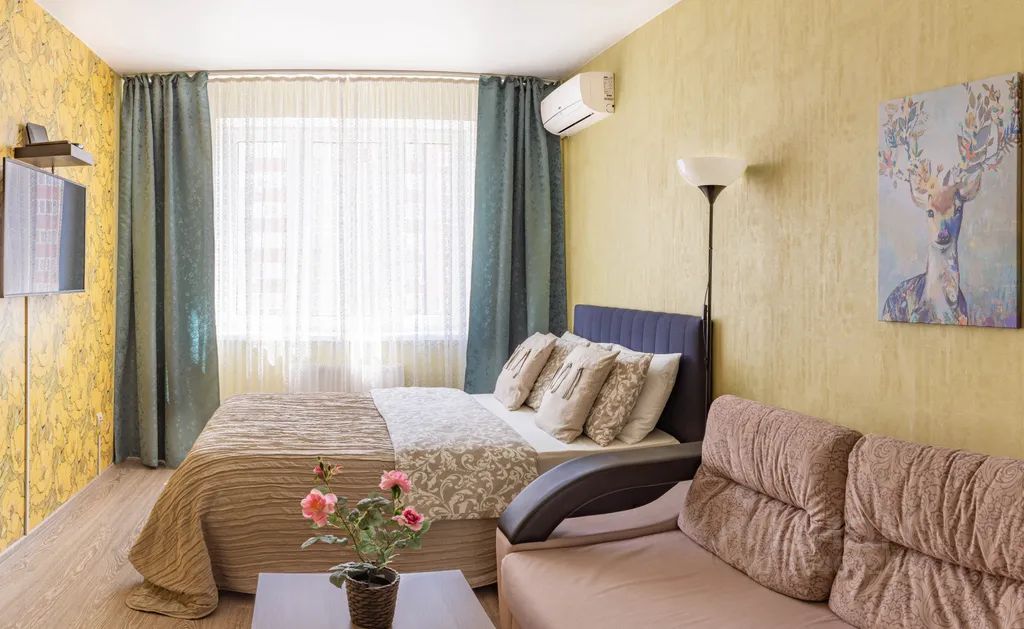 В квартире есть все необходимое для проживания, кабельное ТВ и wi-fi, качественное постельное белье 100% хлопок, комплект полотенец, посуда в полной комплектации включая фужеры, утюг + гладильная доска, фен. Фото реальные 100%.