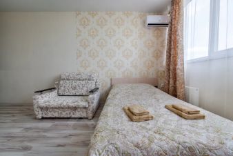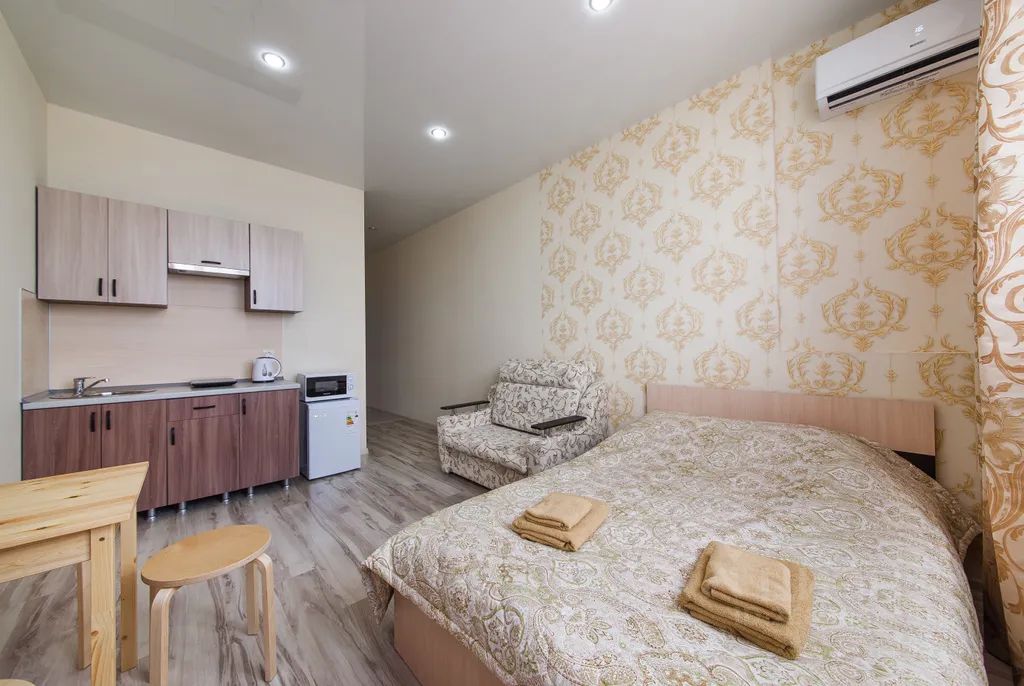 Студия оснащена двуспальным местом (раскладной диван либо кровать), шкафом, телевизором, холодильником, сплит-системой; комфортный санузел; в каждой студии своя оборудованная кухня для самостоятельного приготовления пищи; бесплатный wi-fi. К услугам предоставляется стиральная машина, гладильные принадлежности.