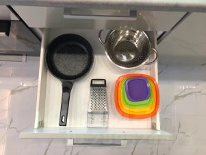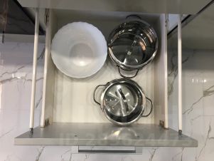 Кухня обеспечена кухонным гарнитуром и всей необходимой кухонной утварью для приготовления пищи и полным комплектом посуды для 4 человек; питьевая вода подведена отдельным краном через фильтрующую систему; большой двухкамерный холодильник.