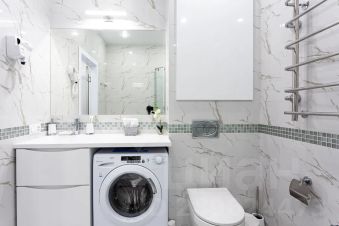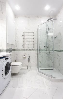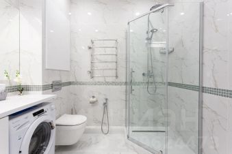 Санузел совмещен. В ванной комнате душевая кабина, умывальник с большим зеркалом и феном; унитаз, гигиенический душ; стиральная машина-автомат