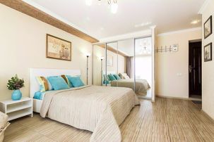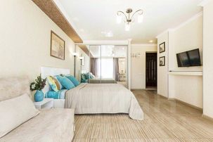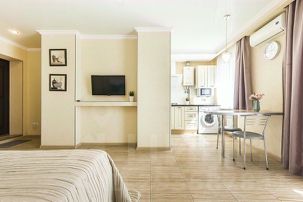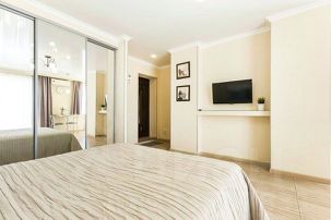А главное Есть всё для комфортного проживания: двуспальная кровать с ортопедическим матрасом, диван-кровать, встроенный кухонный гарнитур натуральное дерево, большой зеркальный шкаф-купе, сплит/система, жк-телевизор, стиральная машинка, холодильник, эл/чайник, СВЧ - печь, утюг и гладильная доска, сушка для белья, вся необходимая посуда, хорошее постельное бельё и полотенца.