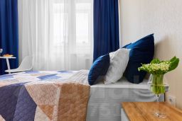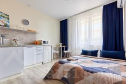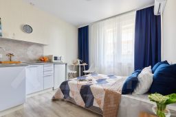 Номер студии рассчитан на трех гостей(ортопедический диван Askona, раскладушка ,так же с ортопедическим матрасом(+500 рублей /сутки )).