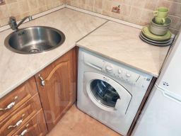 Полностью оборудованная кухня: двухкамерный холодильник, газовая плита с 4 конфорками и духовкой, электрическая вытяжка, стиральная машина-автомат, встроенный гарнитур, кухонный стол и табуреты.