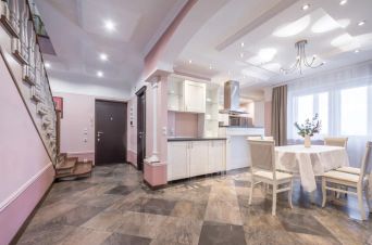 Квартира состоит из 2 изолированных спален, гостиной, кухонного уголка, ванной комнаты на 2-м этаже, душевой с сауной на 1-м этаже, а также гардеробной и постирочной.