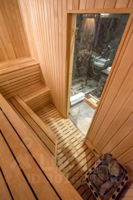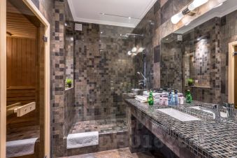 Ванная комната на 1-м этаже оборудована душевой зоной, финской сауной и зеркалом.