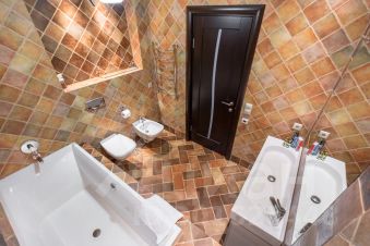 Ванная комната на 2-м этаже оборудована ванной (объём — 200 литров), подвесным унитазом и биде.