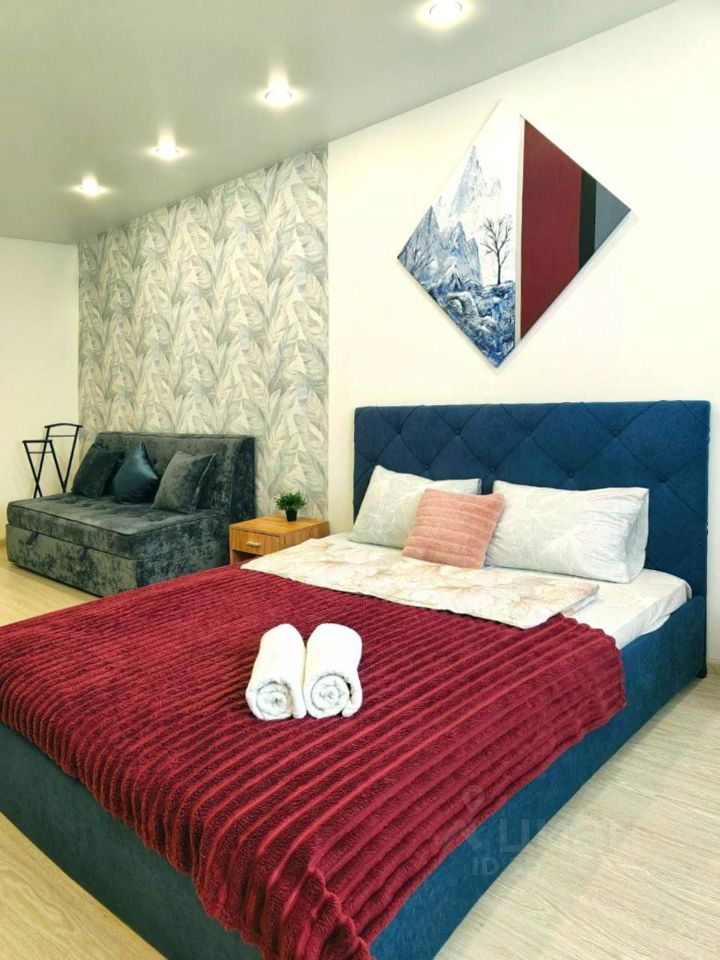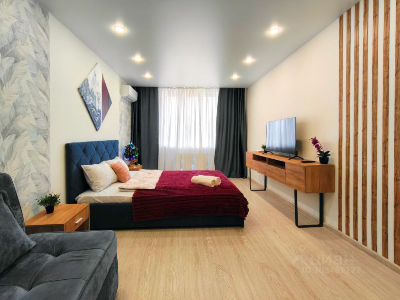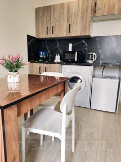 Сдаётся впервые однокомнатная квартира с новым дизайнерским ремонтом. Мы предусмотрели все для вашего комфортного проживания: новая двуспальная кровать с ортопедическим матрасом, раскладной диван, новая мебель и бытовая техника. Шторы блэкаут полностью скроют яркое солнце. Установлены сплит системы на кухне и в комнате. Есть холодильник, электрическая варочная панель, чайник, микроволновка, стиральная машина, посуда, два телевизора.
