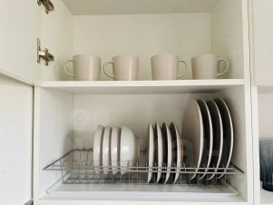 На кухне вся необходимая бытовая техника и посуда, для приготовления и приёма пищи. Чай, кофе, сахар.