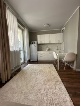 Студия выполнена с современным евроремонтом, что создает комфортную атмосферу для проживания. В квартире есть вся необходимая мебель и техника, включая кухонный гарнитур, плиту, холодильник и стиральную машину. Санузел совмещенный, оснащен современной сантехникой. Лоджия, где можно отдохнуть и насладиться видом, тоже в наличии.