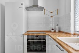 Укомплектованная кухня со всем необходимым: холодильник, варочная панель, чайник, духовка, новая посуда, тостер и мелочи на кухне.