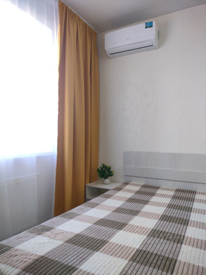 Комната: шкаф для одежды, двуспальная кровать (ширина 140 см), кресло-кровать, телевизор, сплит-система.