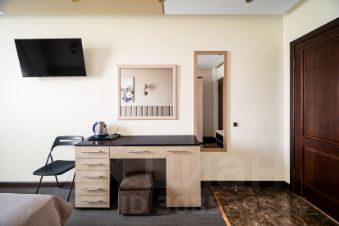 Имеется телевизор, кондиционер, отопление, шкаф, вешалка, зеркало, комод, прикроватные тумбочки с настольными лампами, журнальный столик, холодильник, стулья, фен, посуда, столовые приборы, антимоскитная сетка и плотные шторы.
