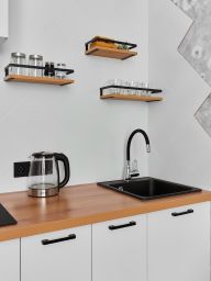 - Полностью укомплектованная кухня (холодильник, варочная панель, духовой шкаф, вытяжка, микроволновая печь, чайник, посуда (от чашек до кастрюли и конечно чай и прочие мелочи).