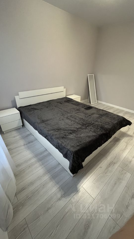 В комнате есть двуспальная кровать с матрасом Аскона (средней жесткости), прикроватные тумбы и зеркало.
