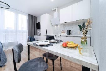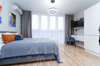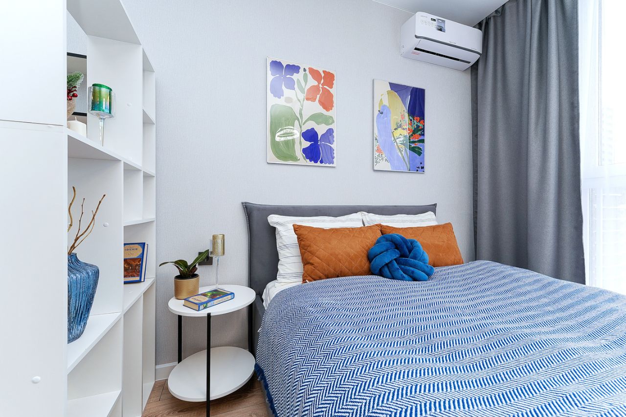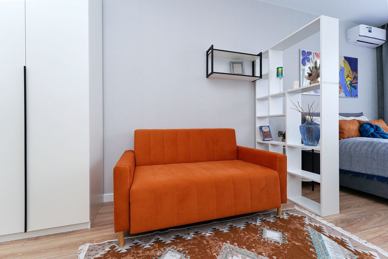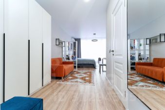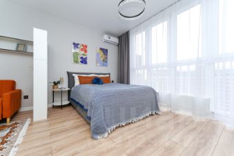 Двуспальная кровать с ортопедическими матрасом , диван раскладывается и можно использовать как еще одно спальное место. Кухня вся с встроенной техникой; большой холодильник, посудомойка, микроволновая печь, варочная панель, вытяжка. Столовая группа оснащена круглым столом и двумя стульями, есть дополнительный стул для рабочего столика. В прихожей вместительный шкаф, где можно разместить все свои вещи.