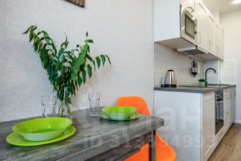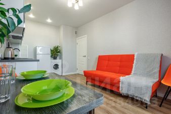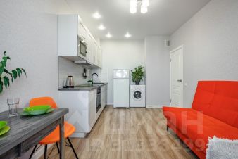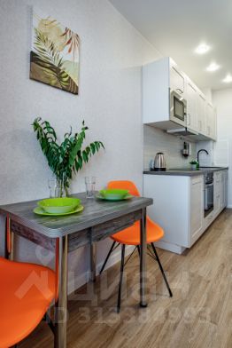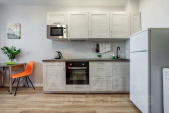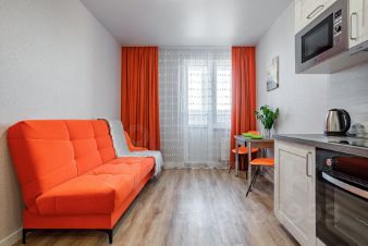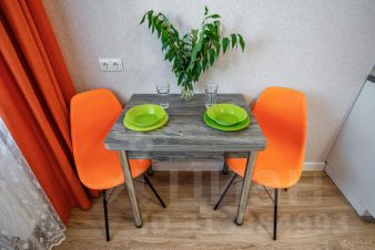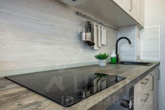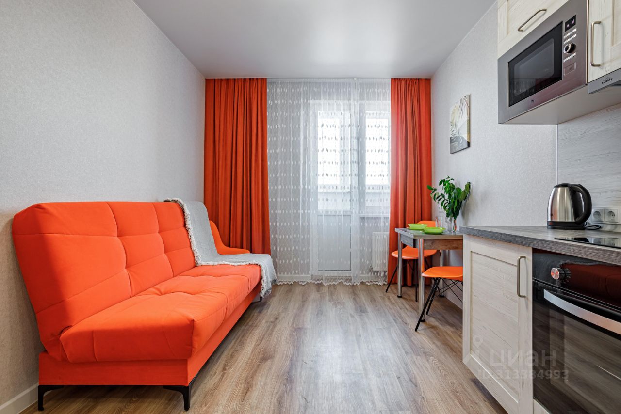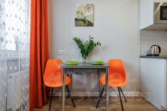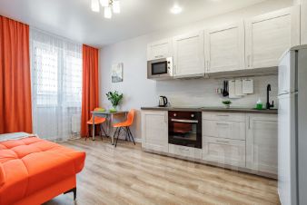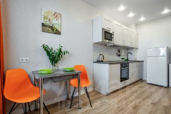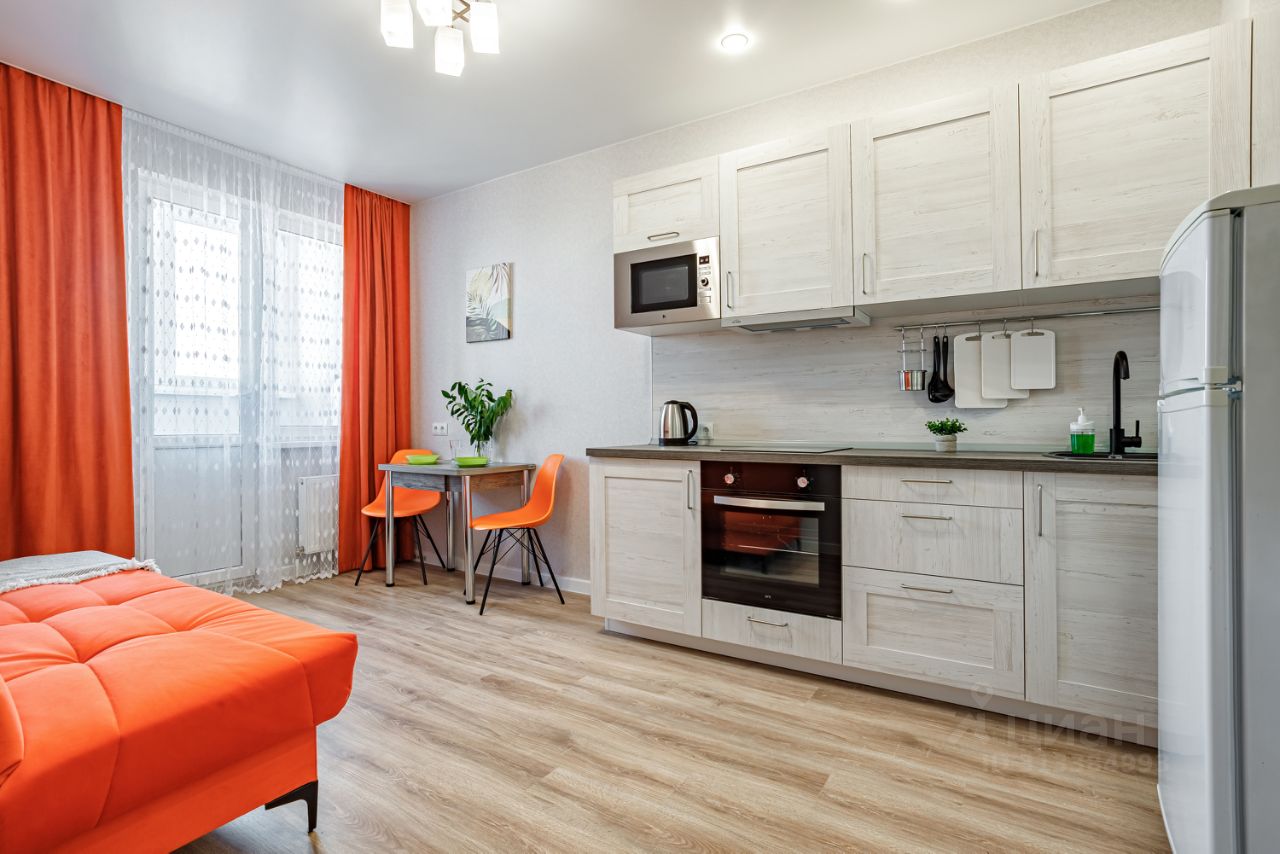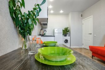 Площадь кухни 15 кв.м. Кухонный модуль оборудован встроенной бытовой техникой, включая плиту, микроволновую печь, места для хранения продуктов. Есть холодильник, стиральная машина, пылесос, утюг, чайник, вся необходимая посуда. Здесь же расположен удобный раскладной диван на 2 спальных места. Оранжевые гардины и диван создадут вам оранжевое настроение.