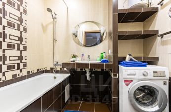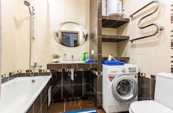 Современный санузел с ванной, стиральной машиной, туалетными принадлежностями и феном, чтобы вы всегда выглядели на высоте.