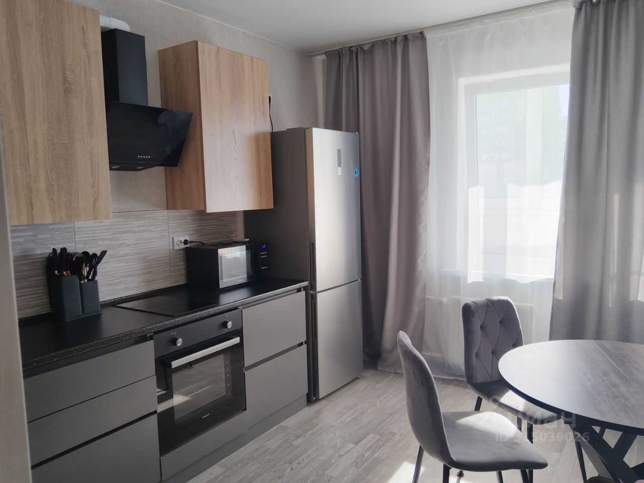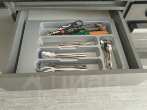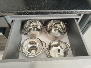 Уютная новая кухня, холодильник, плита, в кухне есть все принадлежности для приготовления пищи.