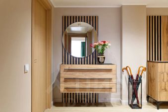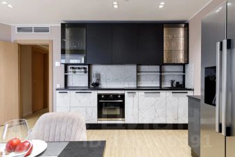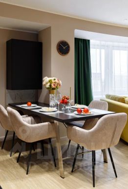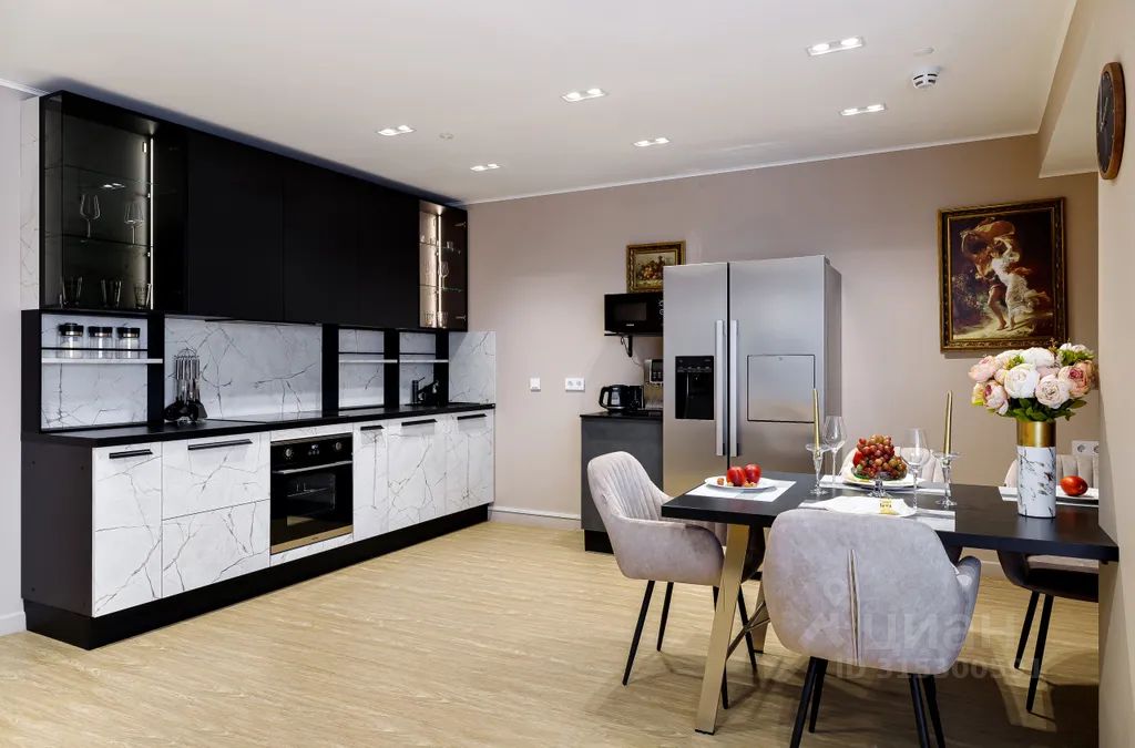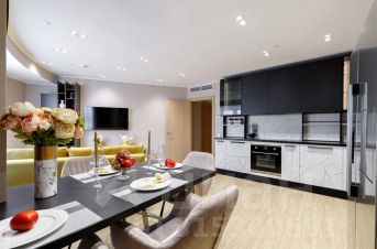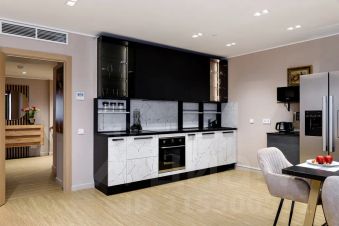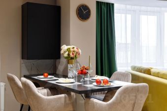 - Кухня-гостиная: полный комплект техники (посудомоечная машина, духовой шкаф, варочная панель), стильная посуда и кухонные принадлежности, чай/кофе для гостей, вместительная гардеробная, раскладной диван-кровать