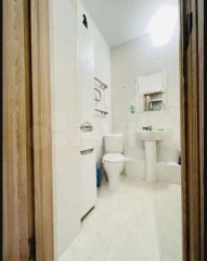 Совмещённый санузел оборудован ванной, унитазом, раковиной, шкафом.