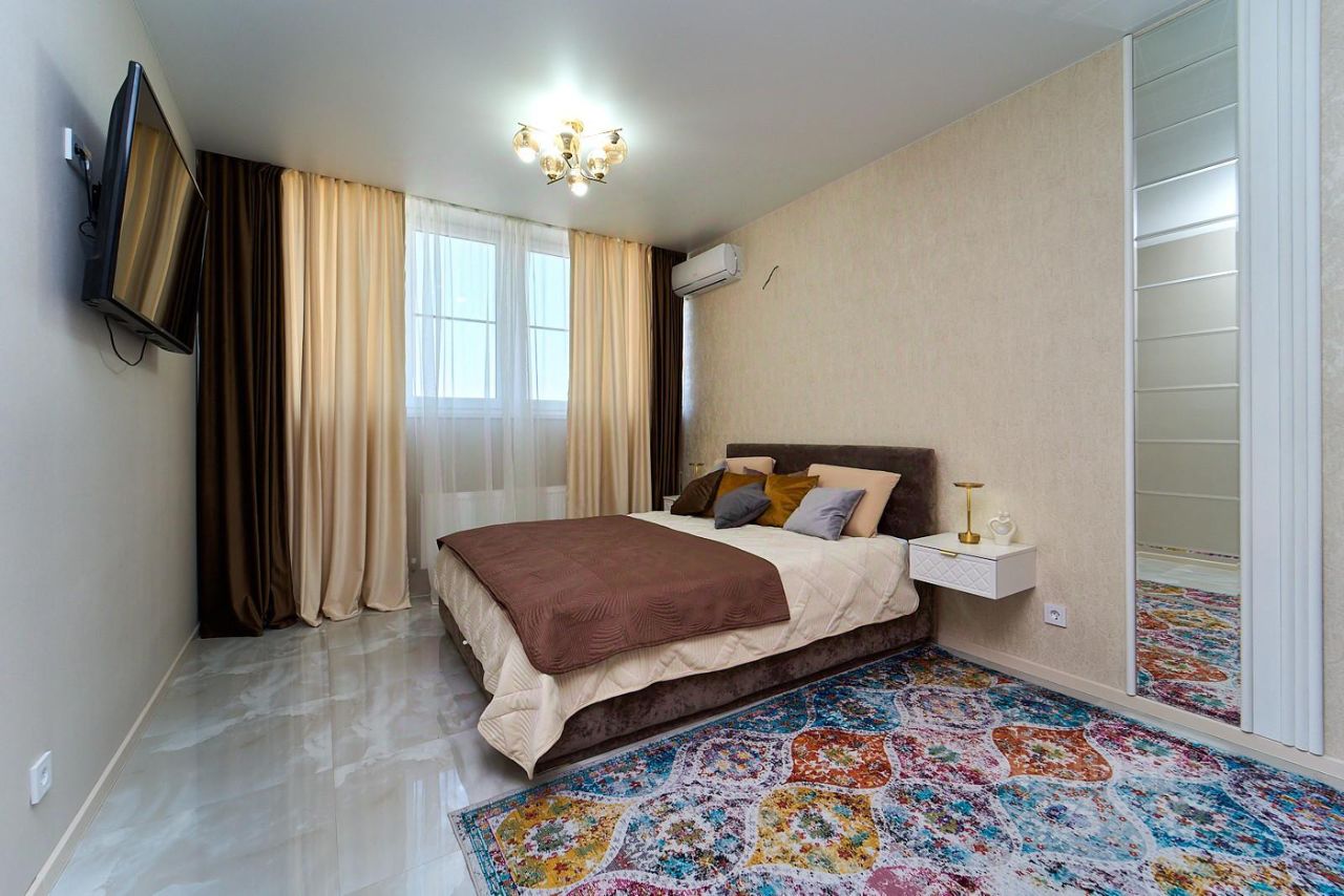 сплит, телевизор, холодильник ноуфрост, стиральная машина, вытяжка, варочная ИНДУКЦИОННАЯ плита, вся мебель на фото . Кровать матрац фирмы матрамакс. Квартира теплая, уютная, в ней ни кто не жил. Ремонт очень дорогой,техника в плёнке. рядом школы, сады, байдарочная база и Кубань.