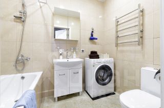 Современный санузел с ванной, стиральной машиной, туалетными принадлежностями и феном, чтобы вы всегда выглядели на высоте.