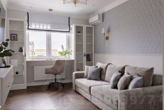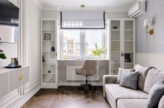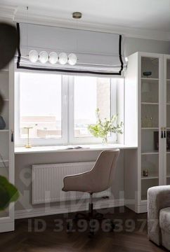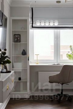 Комфортная рабочая зона для учебы или работы с хорошим видом из окна и системой для хранения документов или книг.
