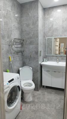 В санузле: большая ванная, полотенцесушитель, тумба с раковиной, зеркало с подсветкой, стиральная машина.