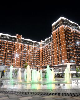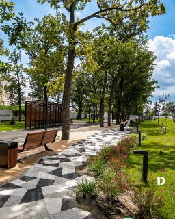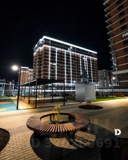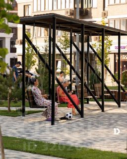Территория комплекса закрытая, где располагаются: тренажеры, детская площадка, множество мест для отдыха, работы или учебы.