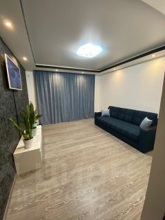 Одна комната с большим раскладным диваном 1,80х2,00м., телевизор , сплит, люстра с пультом регулировки яркости.