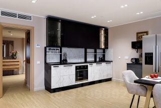 Кухня-гостиная: полный комплект техники (посудомоечная машина, духовой шкаф, варочная панель), стильная посуда и кухонные принадлежности, чай/кофе для гостей, вместительная гардеробная, раскладной диван-кровать