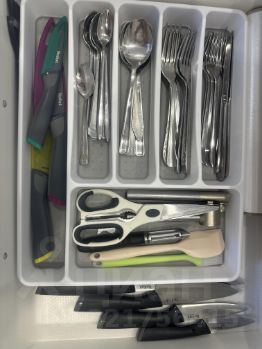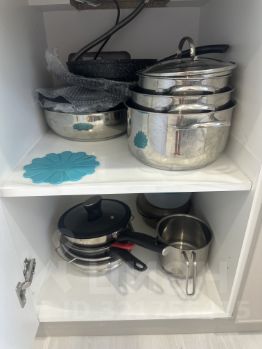 Вся посуда новая, несколько кастрюль и сковородок. Бокалы, рюмки и прочее.