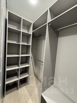 Большая гардеробная со стеклянными раздвижными дверьми, шкафами под верхнюю одежду и полками под обувь.