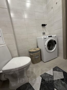 Совмещенный санузел с ванной и стиральная машиной.