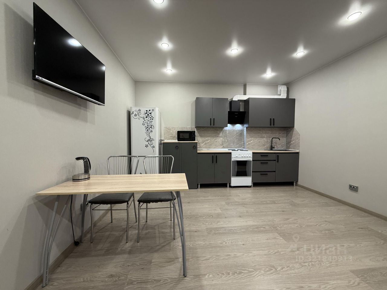На кухне есть холодильник, микроволновка, электрочайник, эл. плита, телевизор, новый мощный кондиционер, выход на застекленный балкон.