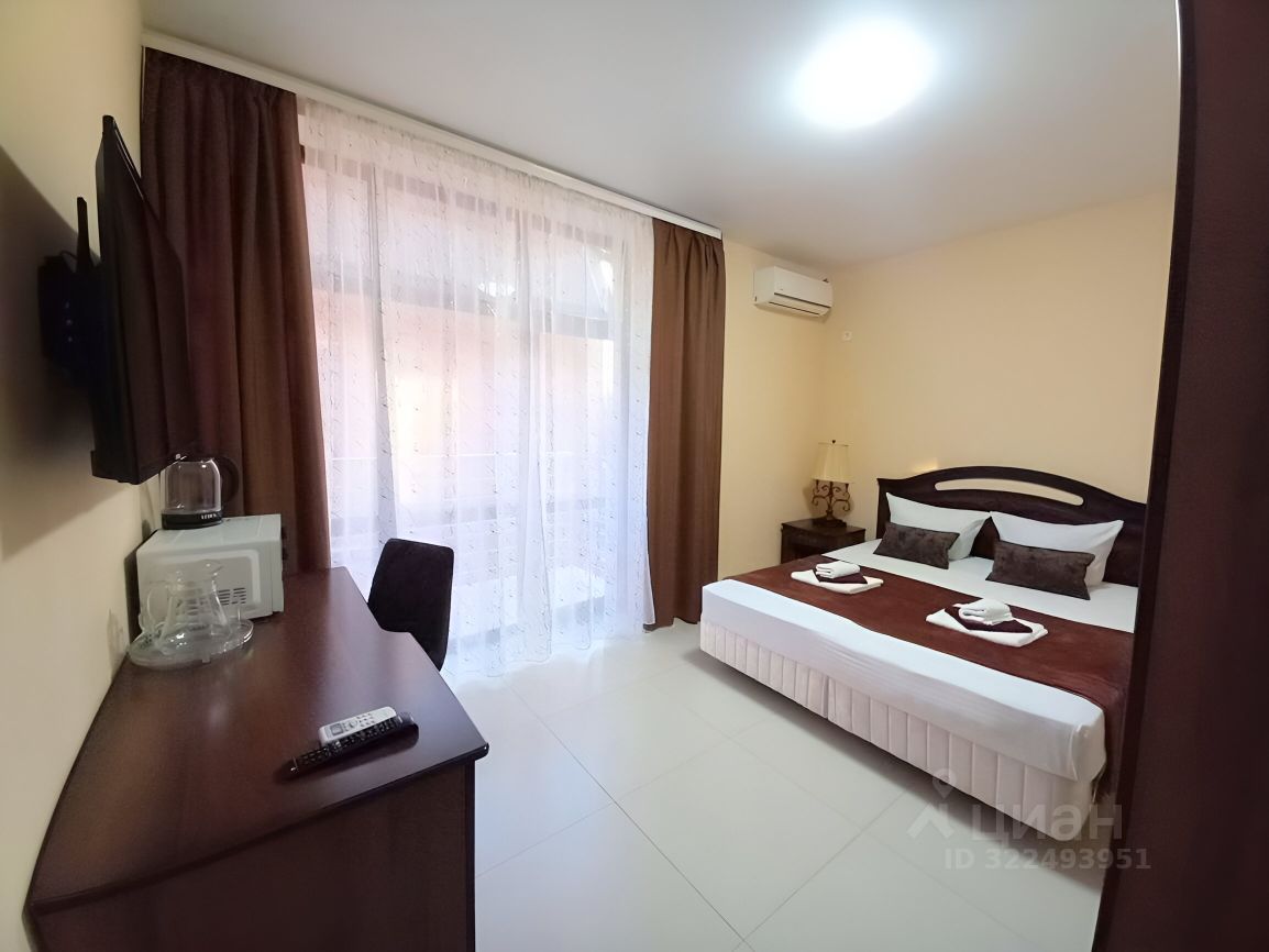 Сдаётся уютная студия на двоих с балконом. В комнате чайник, микроволновка, холодильник, кондиционер. Вся техника и мебель новые. Санузел совмещённый: душевая кабина. В цокольном этаже расположена детская игровая комната, прачечная, кухня-столовая. На улице имеется маннальная зона, столы, лавочки.