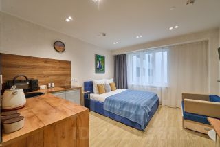 Централизованное кондиционирование, холодильник, микроволновая печь, варочная панель, чайник, фен, гладильные принадлежности
