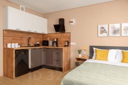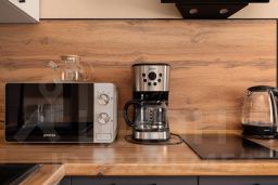 Централизованное кондиционирование, стиральная машина, холодильник, микроволновая печь, варочная панель, чайник, кофеварка, фен, гладильные принадлежности
