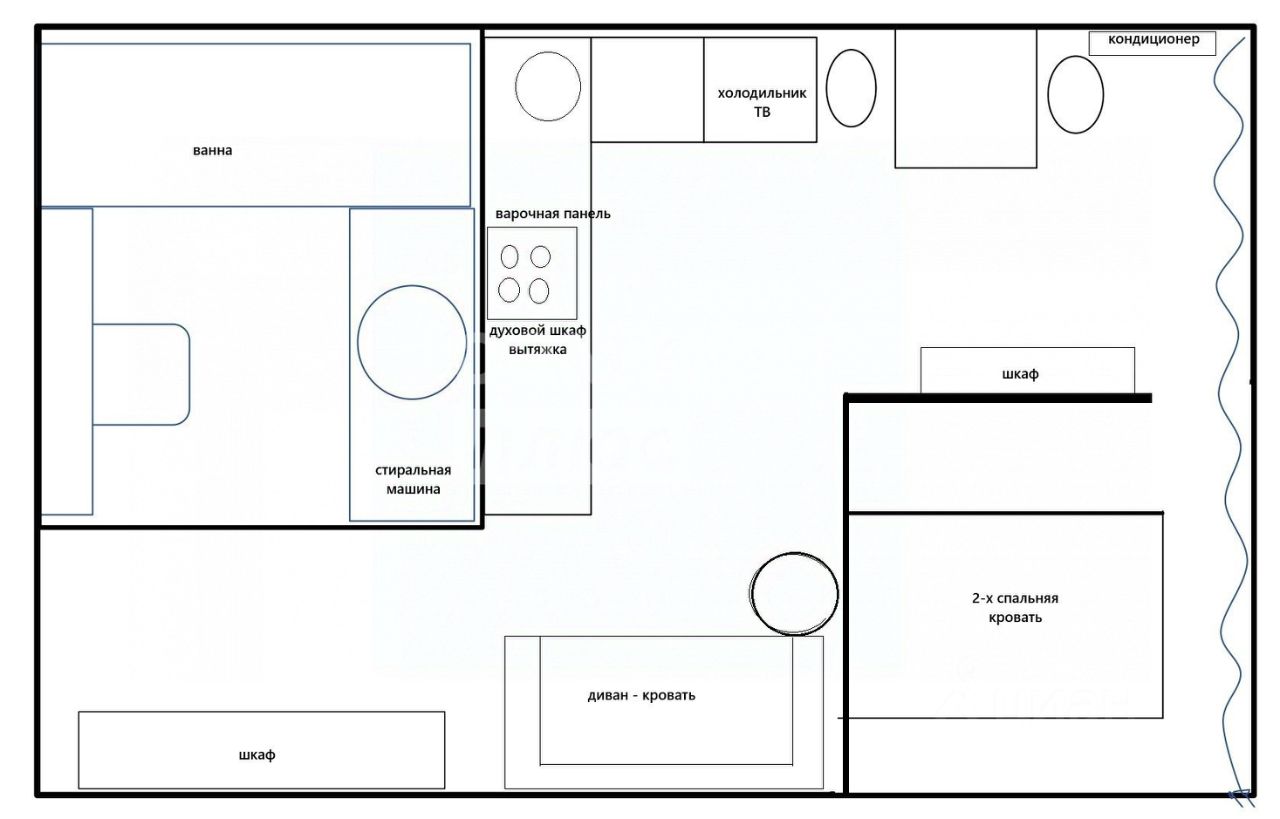 • Укомплектованная кухня: духовой шкаф, варочная панель, вытяжка, холодильник,