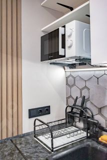 Квартира выполнена в современном стиле, обладает качественной мебелью как в комнате, так и на кухне. В наличии вся необходимая техника: кондиционер, холодильник, телевизор и стиральная машина. Ванная комната оборудована душевой кабиной. Из окон открывается вид во двор, что создаёт атмосферу уюта и спокойствия.