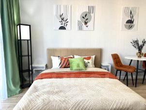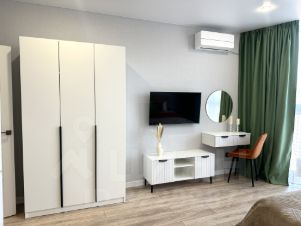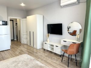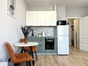 В квартире выполнен современный ремонт, есть вся необходимая мебель — как на кухне, так и в зоне гостиной. Оснащена квартира также всей необходимой техникой: кондиционер, холодильник, телевизор и стиральная/сушильная машина. Планировка студии удобная и продуманная, санузел совмещён и оборудован ванной.