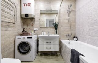 Современная ванная комната: Оцените удобство ванны, оснащенной всем необходимым, включая зеркало и шкафчик для ваших туалетных принадлежностей.