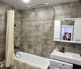Сдaётcя Е-3 кoмнатная квaртира в современном ЖК Дыхание, т.е две комнаты изолированные и большая кухня-гостиная. Просторная и светлая квартира 55.5 кв.м.,  новый ремонтом, где есть вся бытовая техника, сантехника в ванной комнате, необходимая мебель для комфортного проживания. В жилых комнатах есть двуспальная кровать+шкаф, раскладной диван+шкаф. Ванная комната совмещенная.
