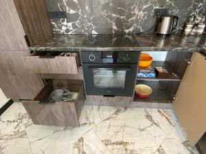 Кухня-гостиная - 18 кв. м.. На кухне установлена новый мебельный гарнитур , укомплектован посудой ( кастрюли, приборы, посуда), новая встроенная техника ( духовой шкаф и место для приготовления пищи, микроволновка, посудомоечная машина, вытяжка, 2-х камерный холодильник, телевизор, кондицыонер), современный раскладной диван, мягкий на ощупь и очень удобный. из ткани " Букле: придает интерьеру легкость и уют, мягкий на ощупь и очень удобный.
