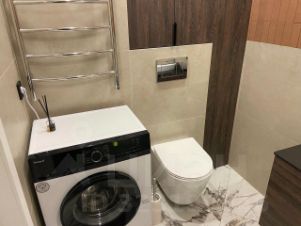Санузел совмещен, выполнен в плитке, качественная керамика. Установлена стиральная машина, Сделана удобная ниша для хранения химии и личных средств гигиены. Монтирован полотенцесушитель с терм регулировкой.