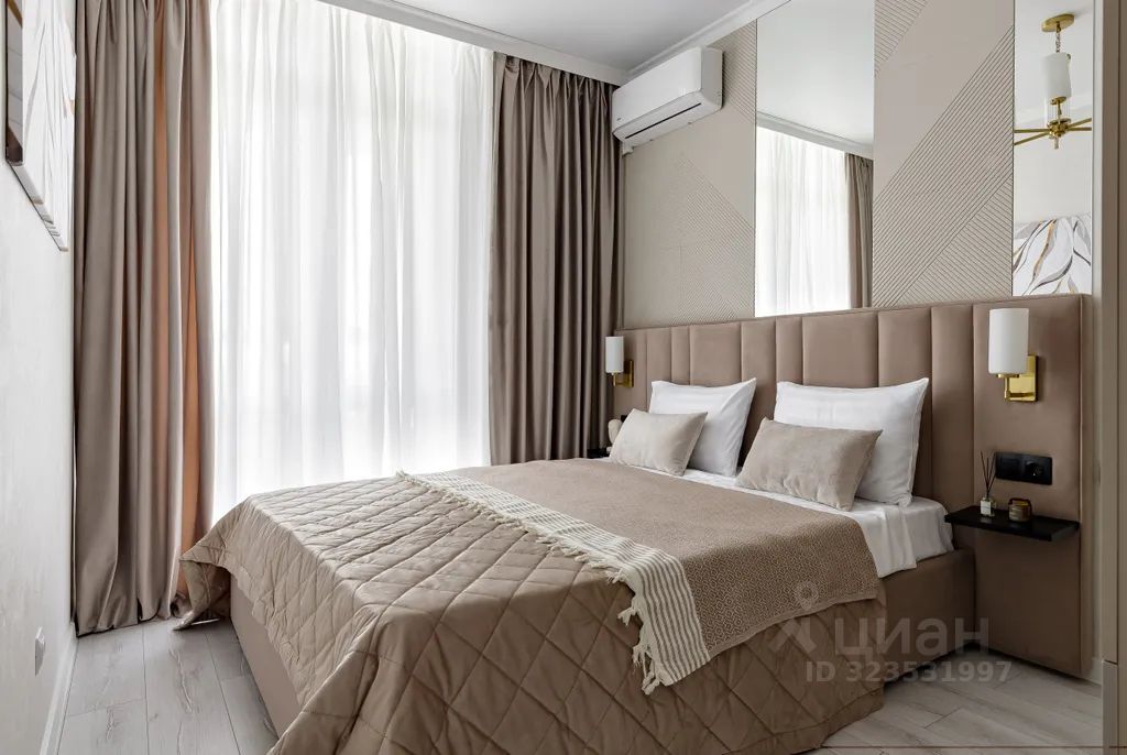 Спальня: удобная кровать 160200 с ортопедическим матрасом, сплит-система для идеального микроклимата и затемняющие шторы блэкаут для крепкого сна.