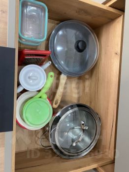 — посуда (столовые приборы, бокалы, кастрюли, сковородки, емкости для хранения сыпучих продуктов, тарелки,)