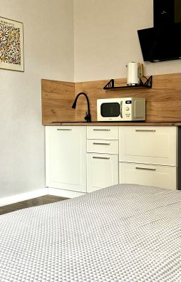 - Кухня: полный набор посуды, чайник, кофемашина, базовая техника.